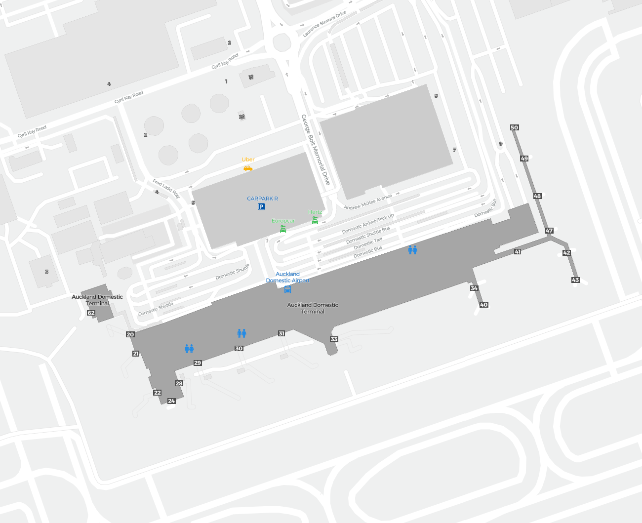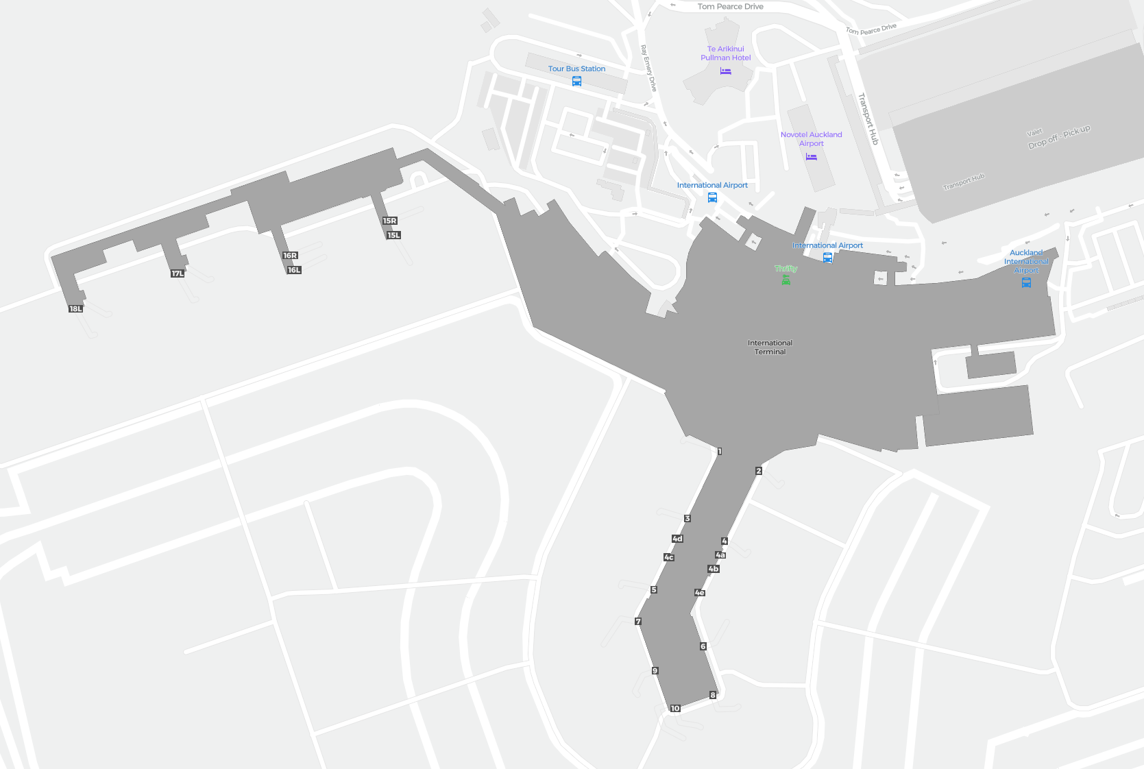 Este é um mapa com zoom sobre Auckland (AKL). O mapa pode dar-lhe uma visão geral da área exterior com terminais, parques de estacionamento, e em alguns aeroportos também detalhes dos portões, serviços de aluguer de carros e outras comodidades ao fazer zoom.