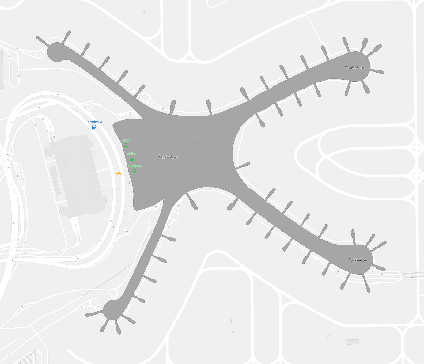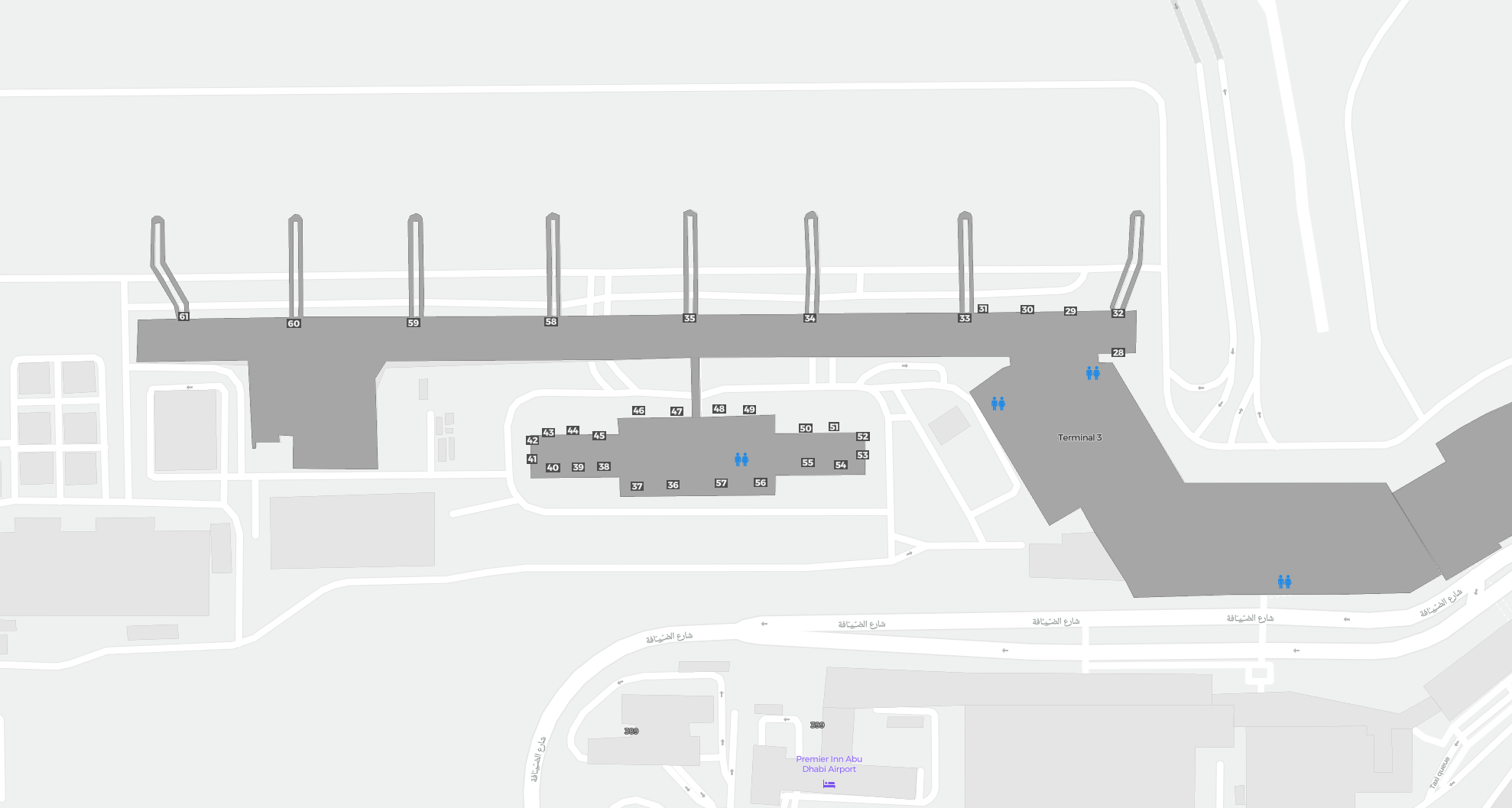 Este é um mapa com zoom sobre Abu Dhabi (AUH). O mapa pode dar-lhe uma visão geral da área exterior com terminais, parques de estacionamento, e em alguns aeroportos também detalhes dos portões, serviços de aluguer de carros e outras comodidades ao fazer zoom.