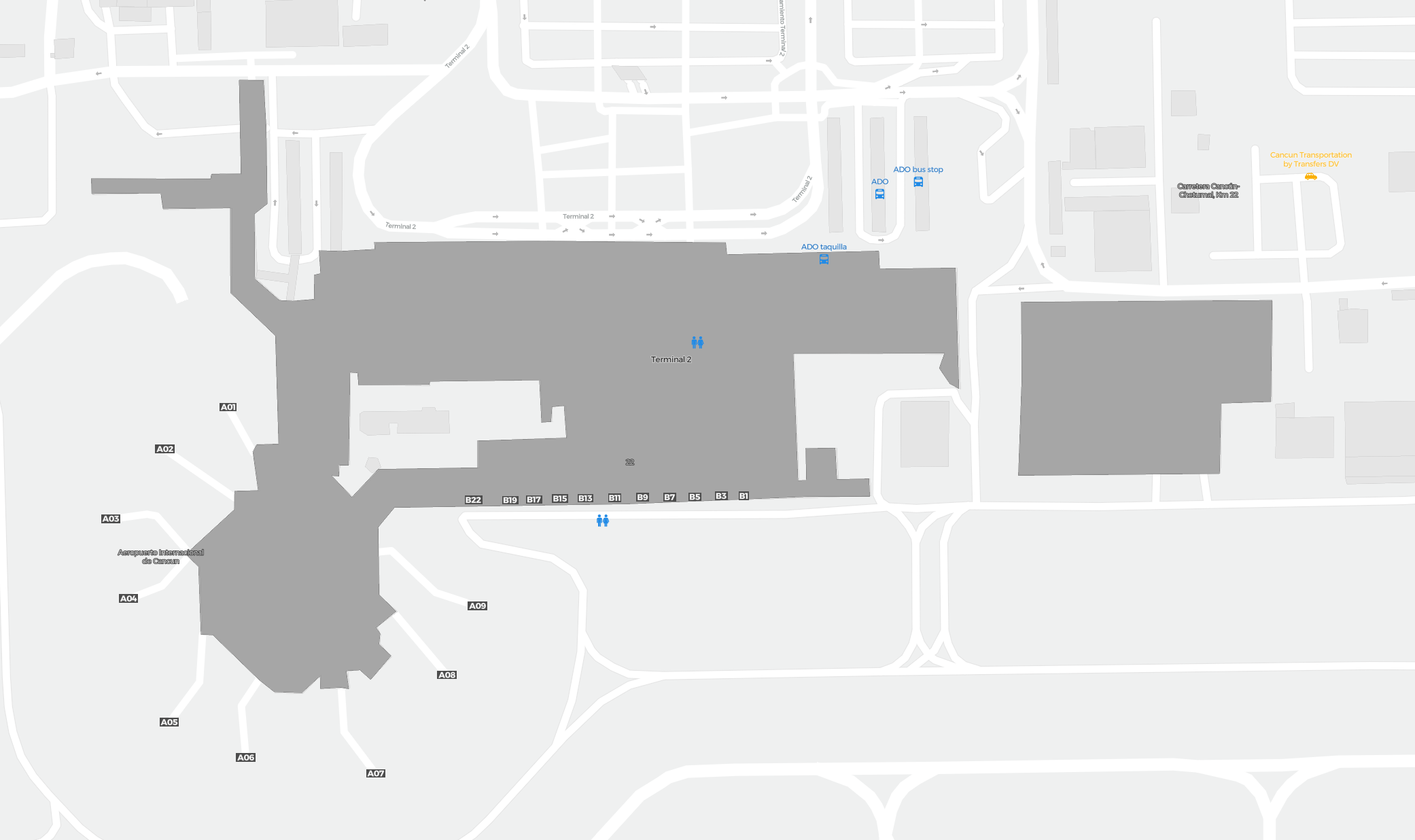 Este é um mapa com zoom sobre Cancún (CUN). O mapa pode dar-lhe uma visão geral da área exterior com terminais, parques de estacionamento, e em alguns aeroportos também detalhes dos portões, serviços de aluguer de carros e outras comodidades ao fazer zoom.