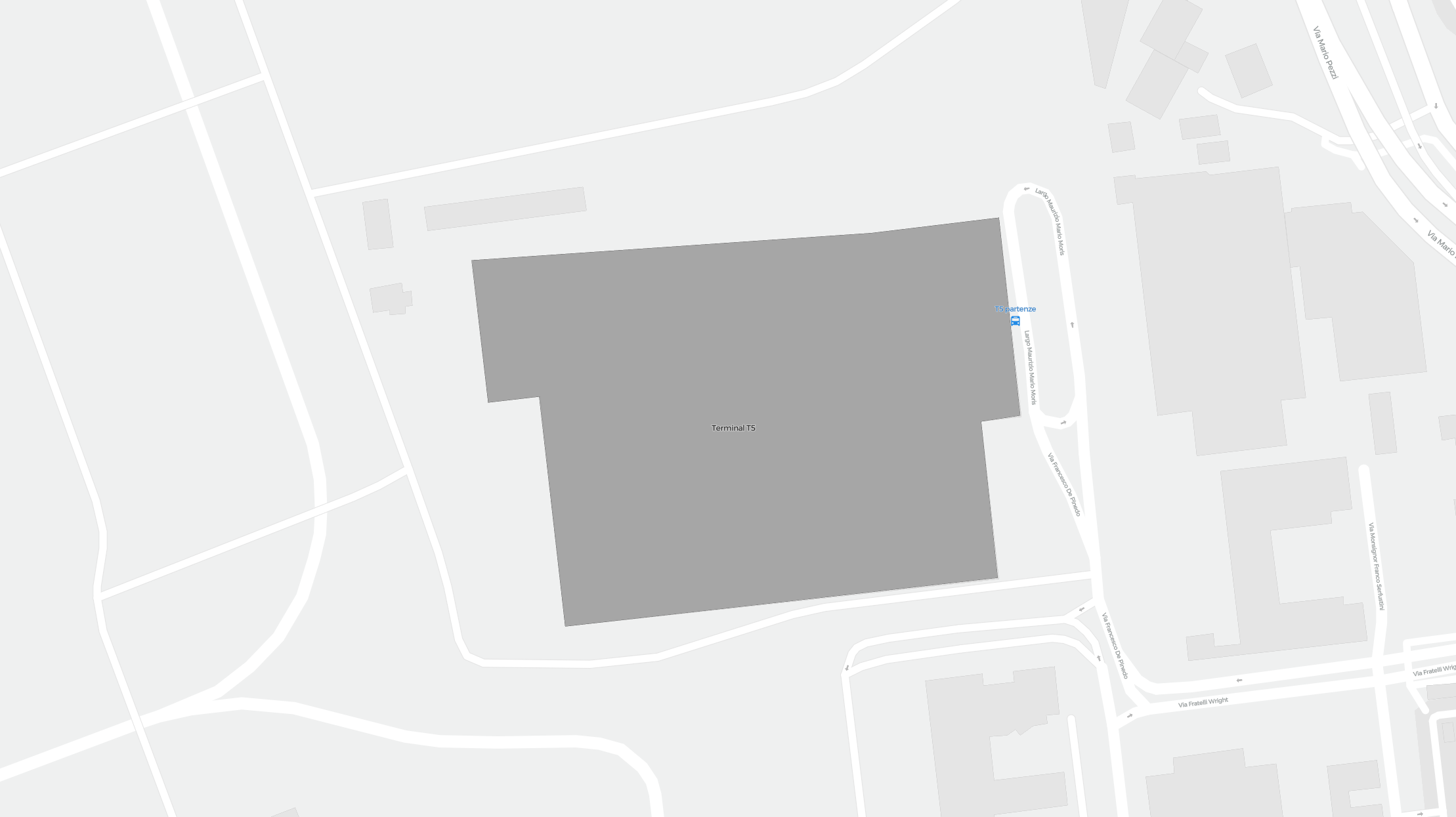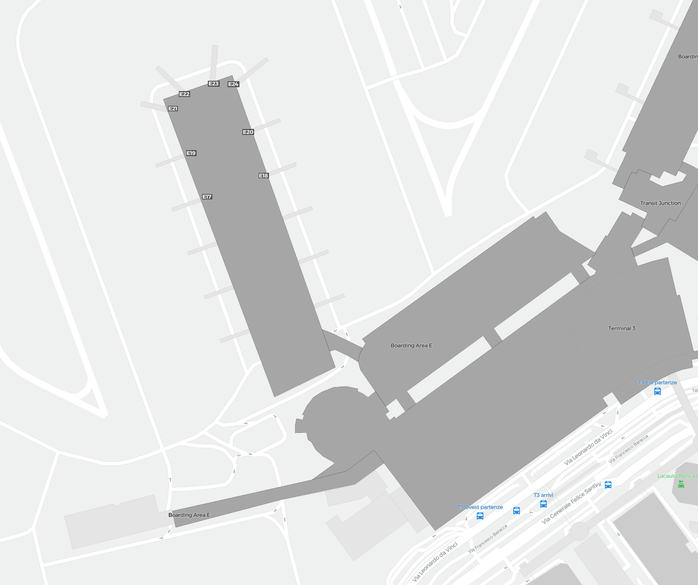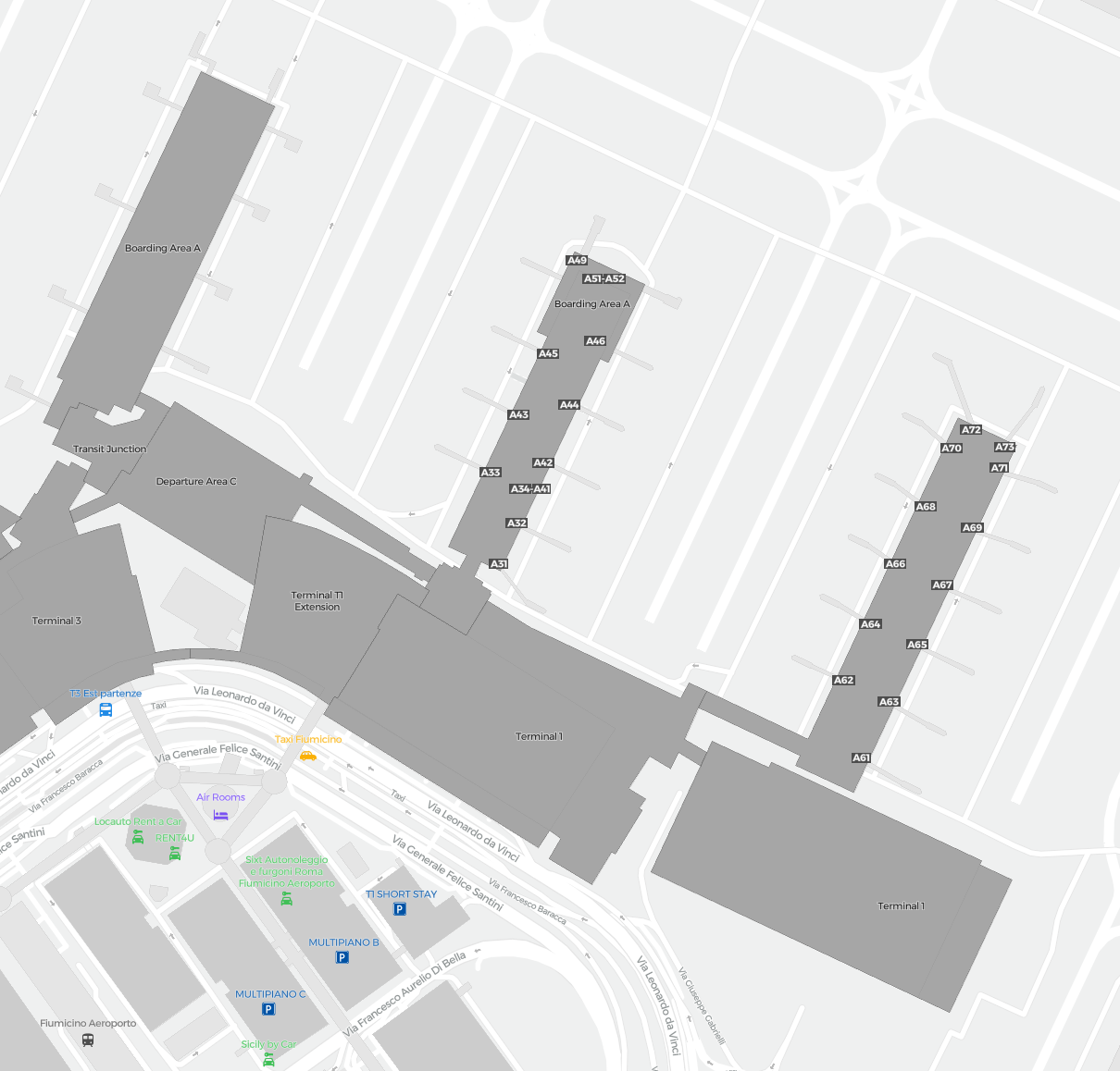 Este é um mapa com zoom sobre Roma (FCO). O mapa pode dar-lhe uma visão geral da área exterior com terminais, parques de estacionamento, e em alguns aeroportos também detalhes dos portões, serviços de aluguer de carros e outras comodidades ao fazer zoom.