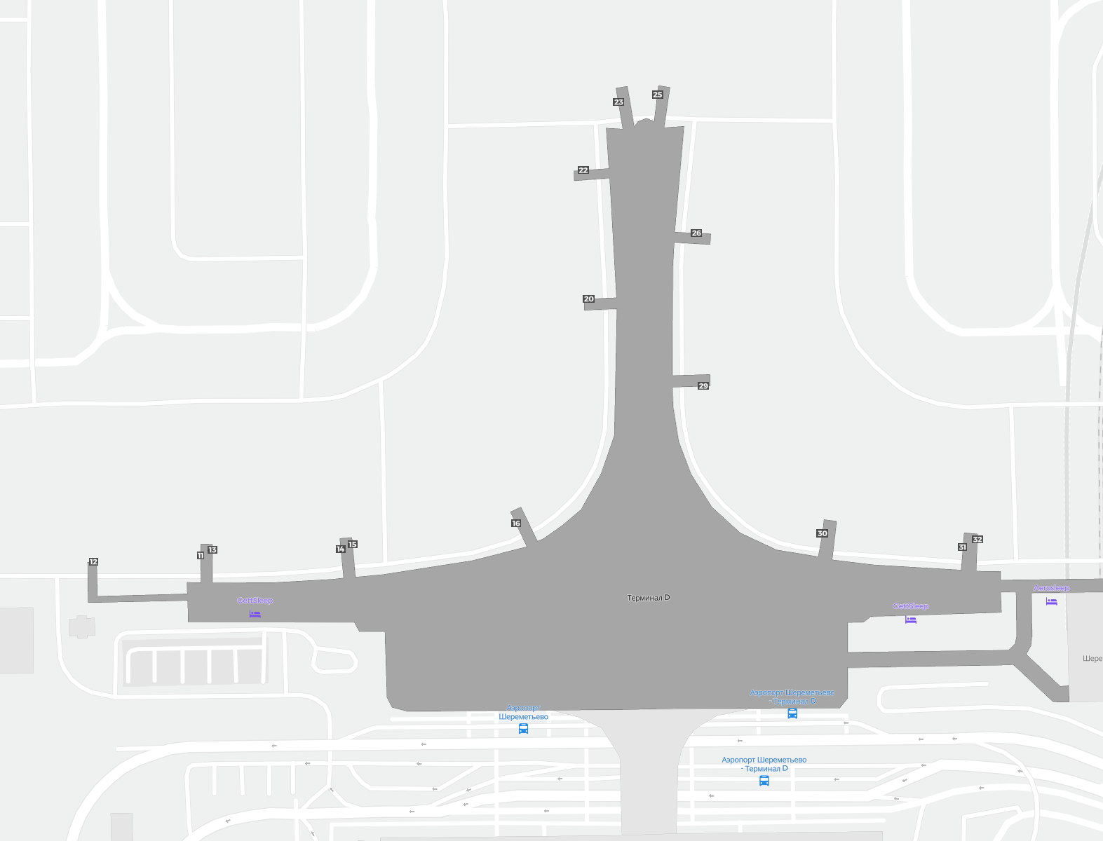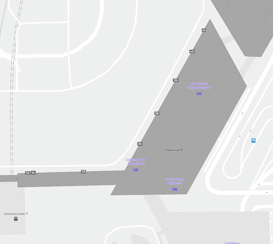 Este é um mapa com zoom sobre Moscovo (SVO). O mapa pode dar-lhe uma visão geral da área exterior com terminais, parques de estacionamento, e em alguns aeroportos também detalhes dos portões, serviços de aluguer de carros e outras comodidades ao fazer zoom.