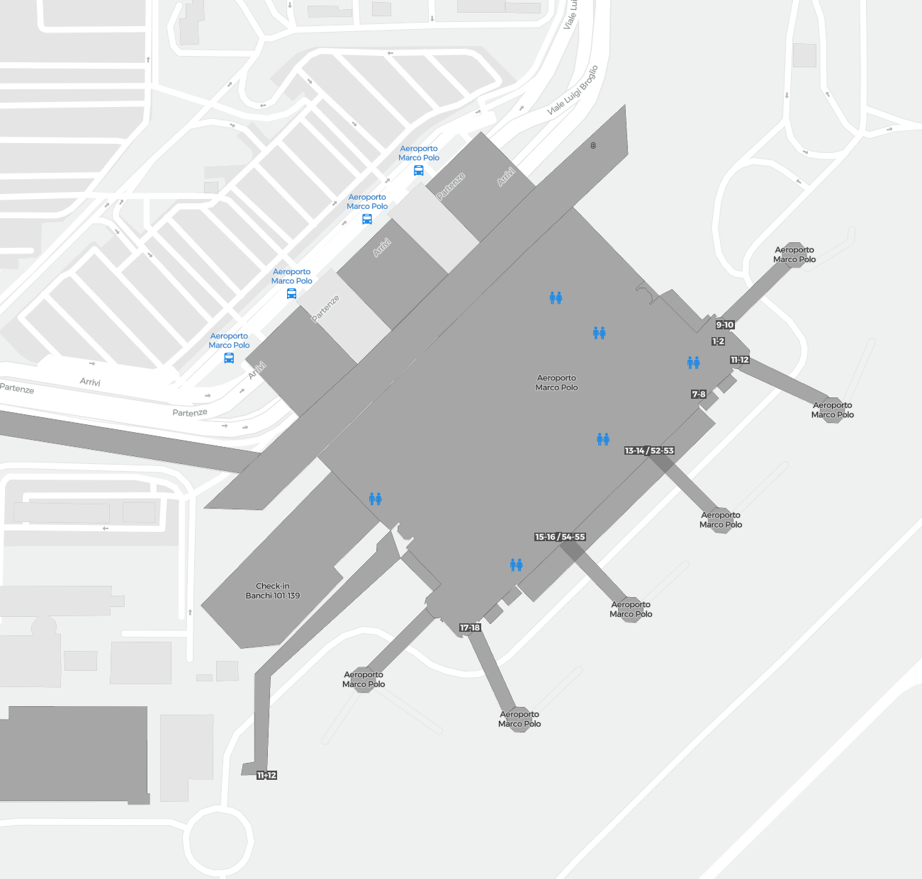 Este é um mapa com zoom sobre Veneza (VCE). O mapa pode dar-lhe uma visão geral da área exterior com terminais, parques de estacionamento, e em alguns aeroportos também detalhes dos portões, serviços de aluguer de carros e outras comodidades ao fazer zoom.