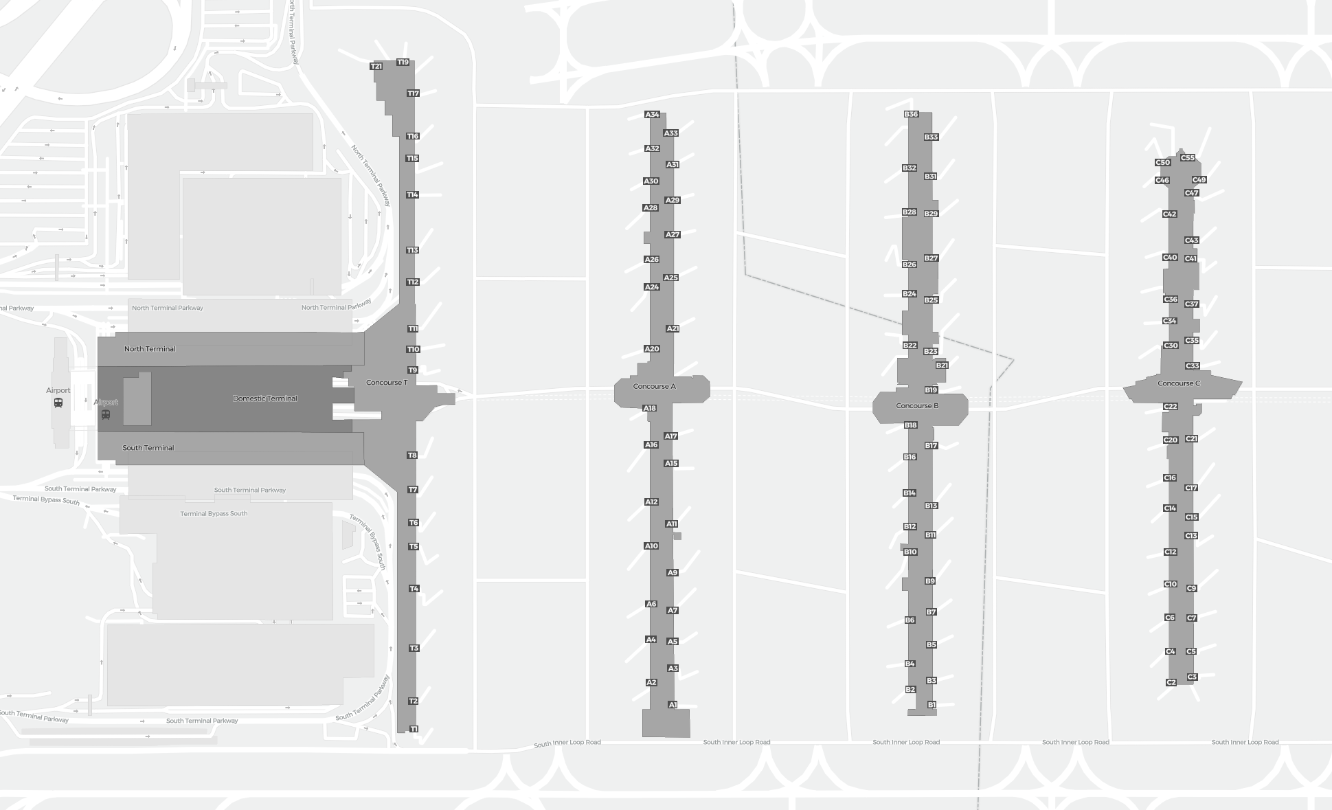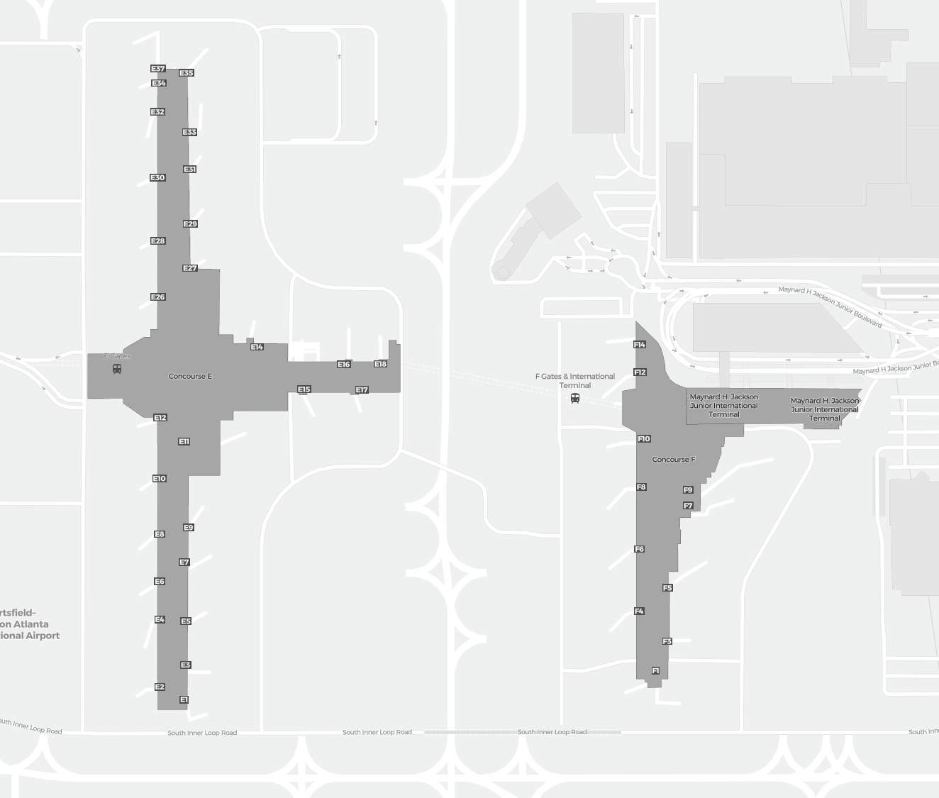 Este é um mapa com zoom sobre Atlanta (ATL). O mapa pode dar-lhe uma visão geral da área exterior com terminais, parques de estacionamento, e em alguns aeroportos também detalhes dos portões, serviços de aluguer de carros e outras comodidades ao fazer zoom.