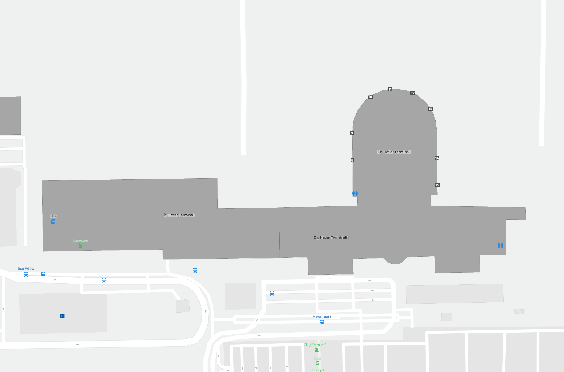 Este é um mapa com zoom sobre Antália (AYT). O mapa pode dar-lhe uma visão geral da área exterior com terminais, parques de estacionamento, e em alguns aeroportos também detalhes dos portões, serviços de aluguer de carros e outras comodidades ao fazer zoom.