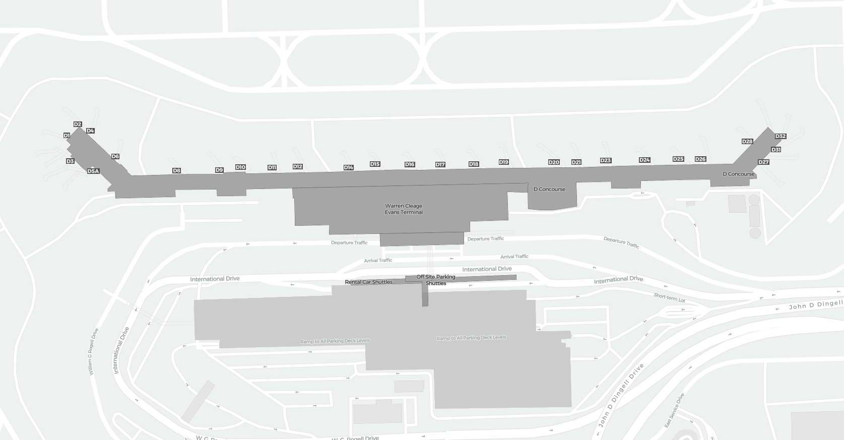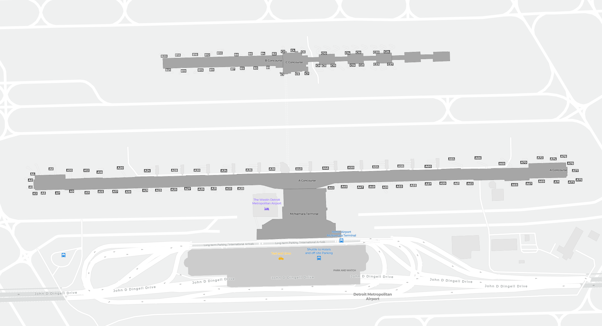 Este é um mapa com zoom sobre Detroit (DTW). O mapa pode dar-lhe uma visão geral da área exterior com terminais, parques de estacionamento, e em alguns aeroportos também detalhes dos portões, serviços de aluguer de carros e outras comodidades ao fazer zoom.