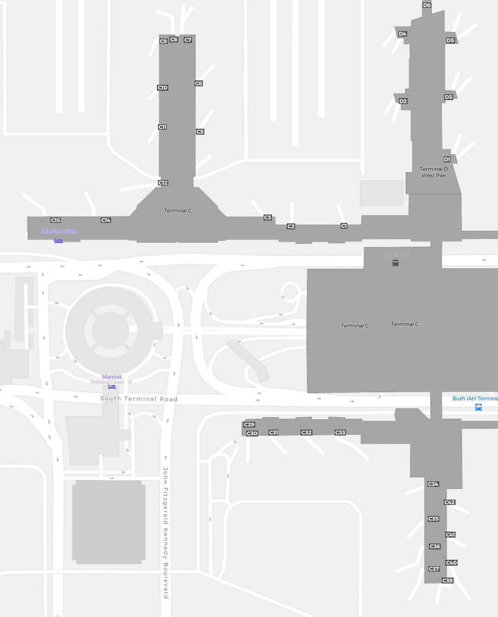 Este é um mapa com zoom sobre Houston (IAH). O mapa pode dar-lhe uma visão geral da área exterior com terminais, parques de estacionamento, e em alguns aeroportos também detalhes dos portões, serviços de aluguer de carros e outras comodidades ao fazer zoom.