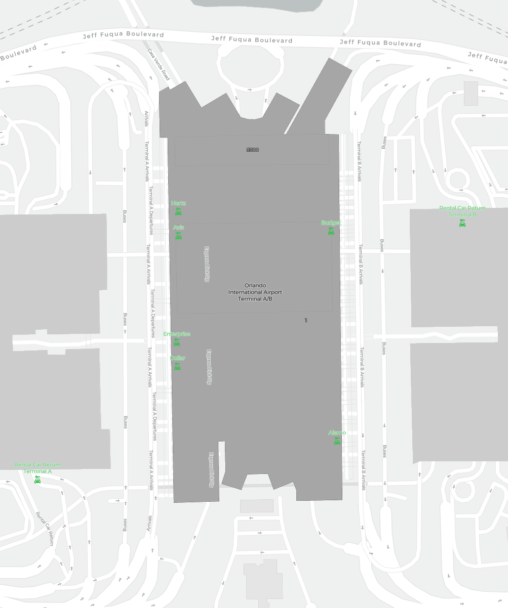 Este é um mapa com zoom sobre Orlando (MCO). O mapa pode dar-lhe uma visão geral da área exterior com terminais, parques de estacionamento, e em alguns aeroportos também detalhes dos portões, serviços de aluguer de carros e outras comodidades ao fazer zoom.