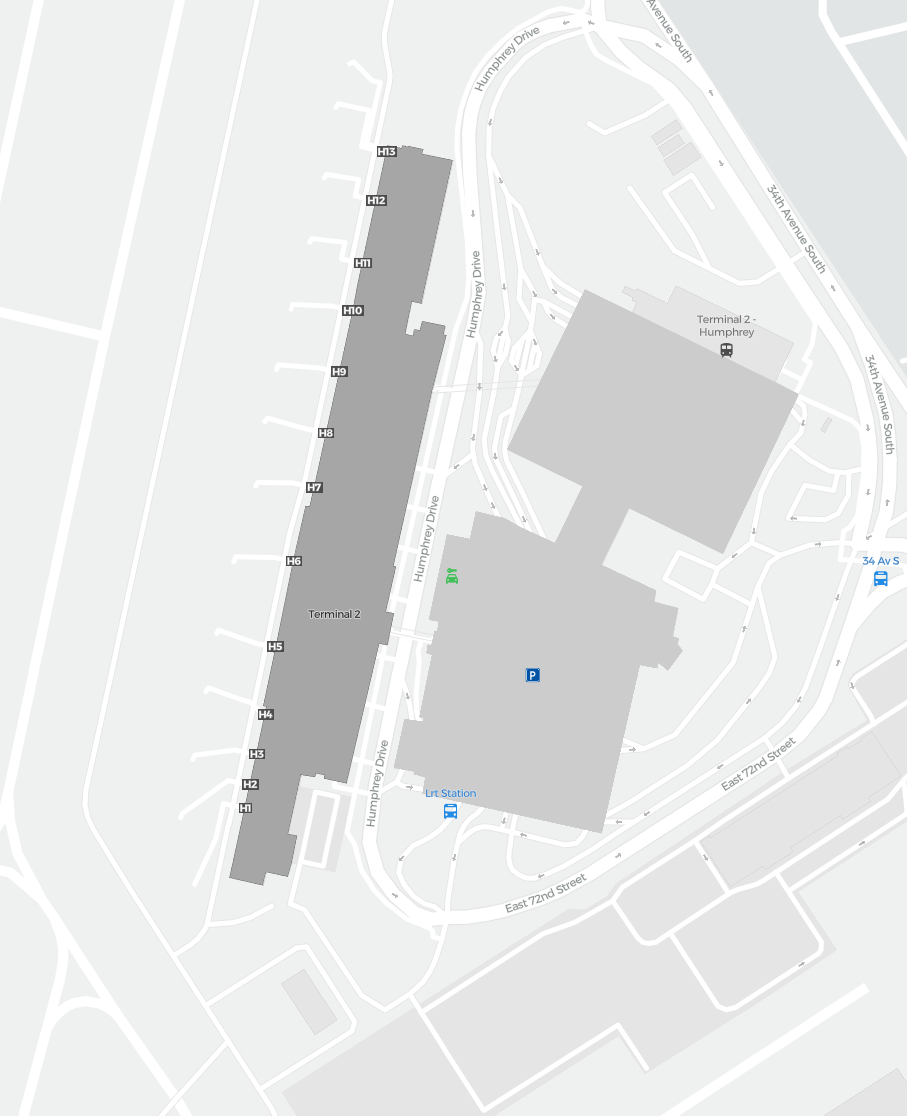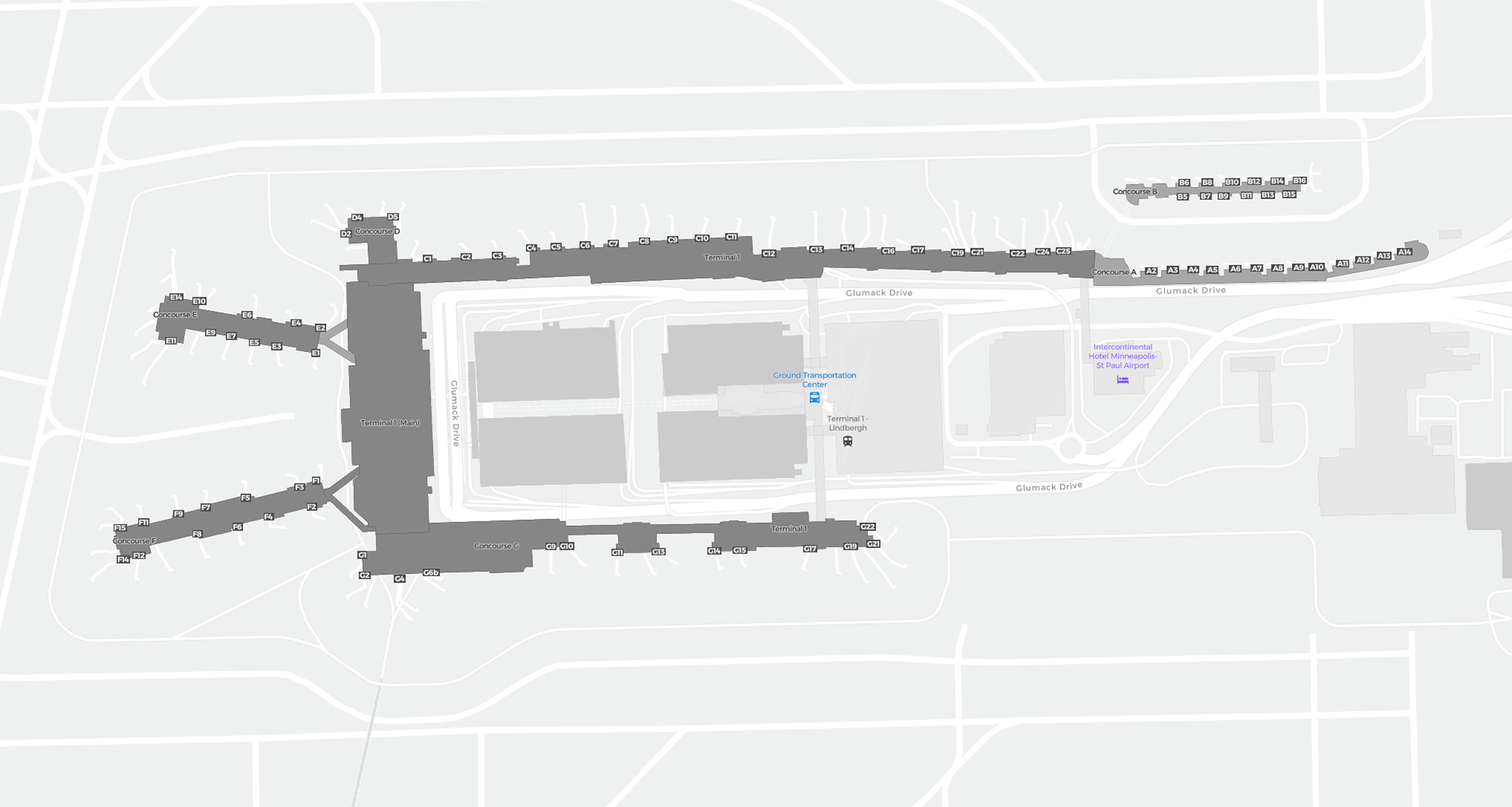 Este é um mapa com zoom sobre Minneapolis (MSP). O mapa pode dar-lhe uma visão geral da área exterior com terminais, parques de estacionamento, e em alguns aeroportos também detalhes dos portões, serviços de aluguer de carros e outras comodidades ao fazer zoom.