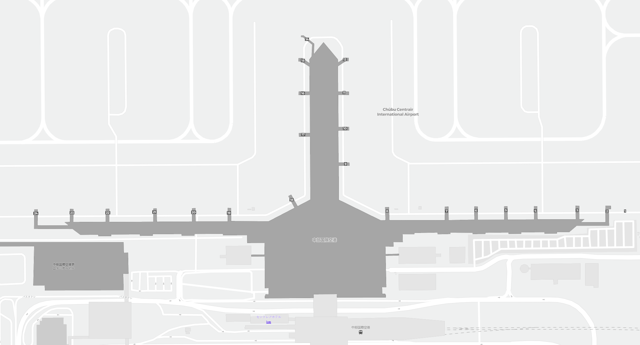 Este é um mapa com zoom sobre Nagóia (NGO). O mapa pode dar-lhe uma visão geral da área exterior com terminais, parques de estacionamento, e em alguns aeroportos também detalhes dos portões, serviços de aluguer de carros e outras comodidades ao fazer zoom.