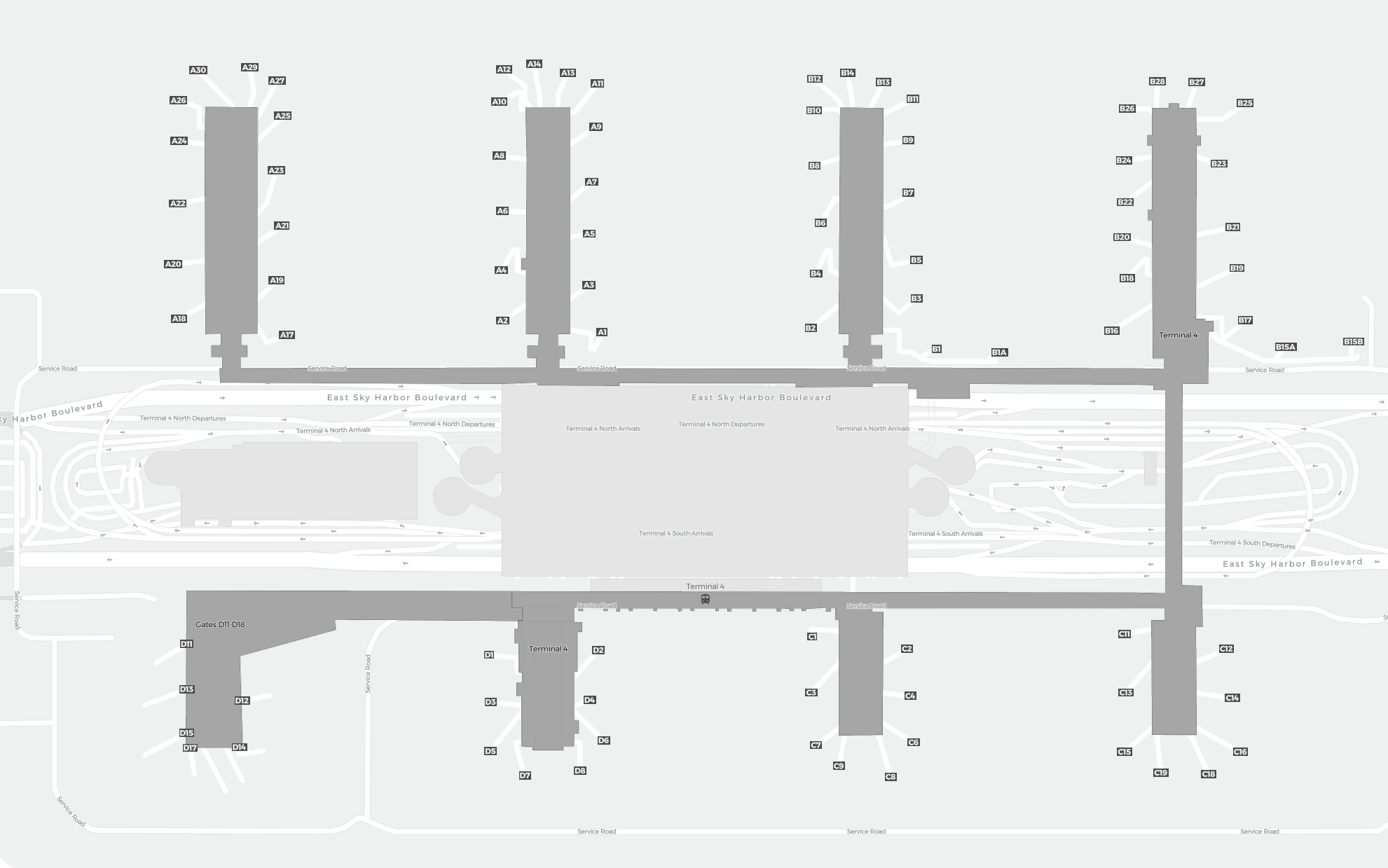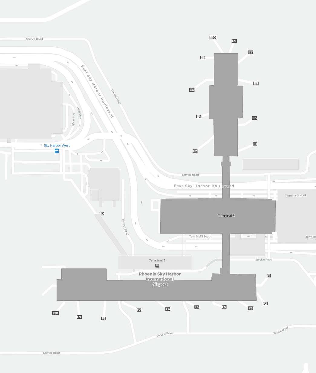 Este é um mapa com zoom sobre Phoenix (PHX). O mapa pode dar-lhe uma visão geral da área exterior com terminais, parques de estacionamento, e em alguns aeroportos também detalhes dos portões, serviços de aluguer de carros e outras comodidades ao fazer zoom.