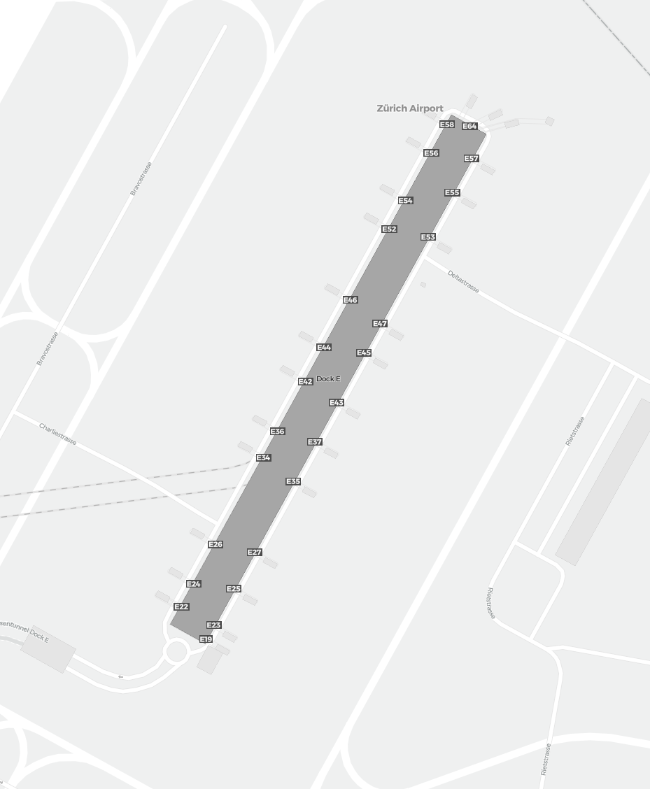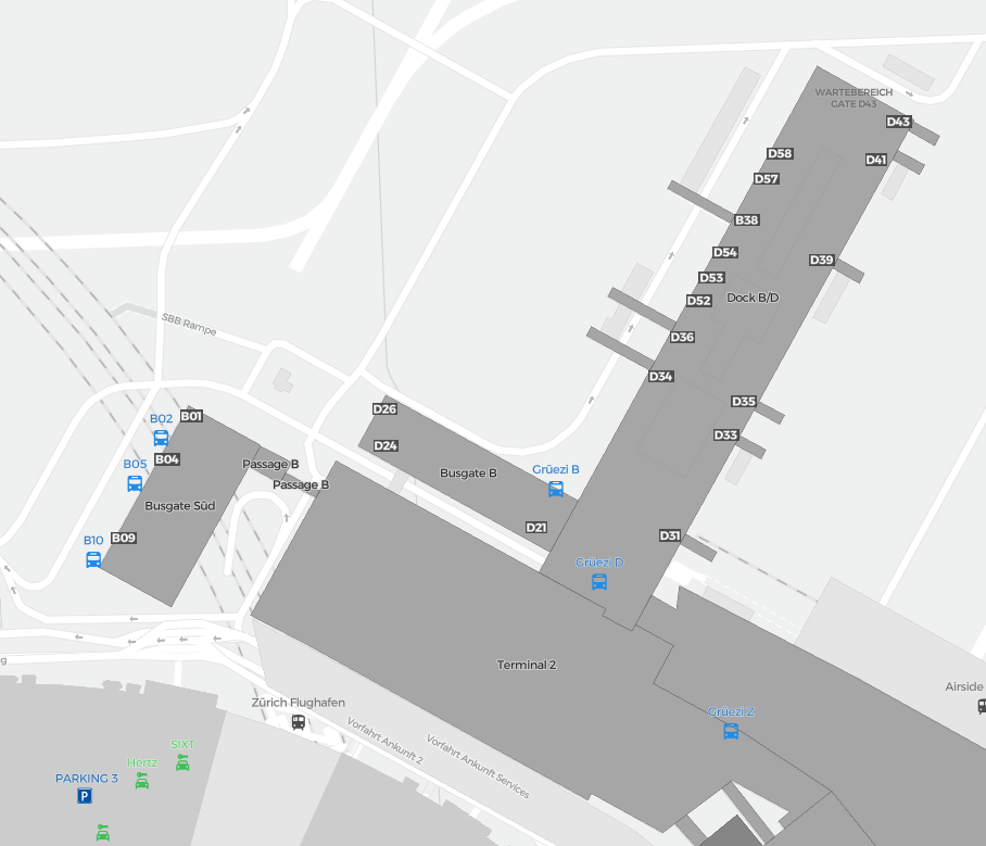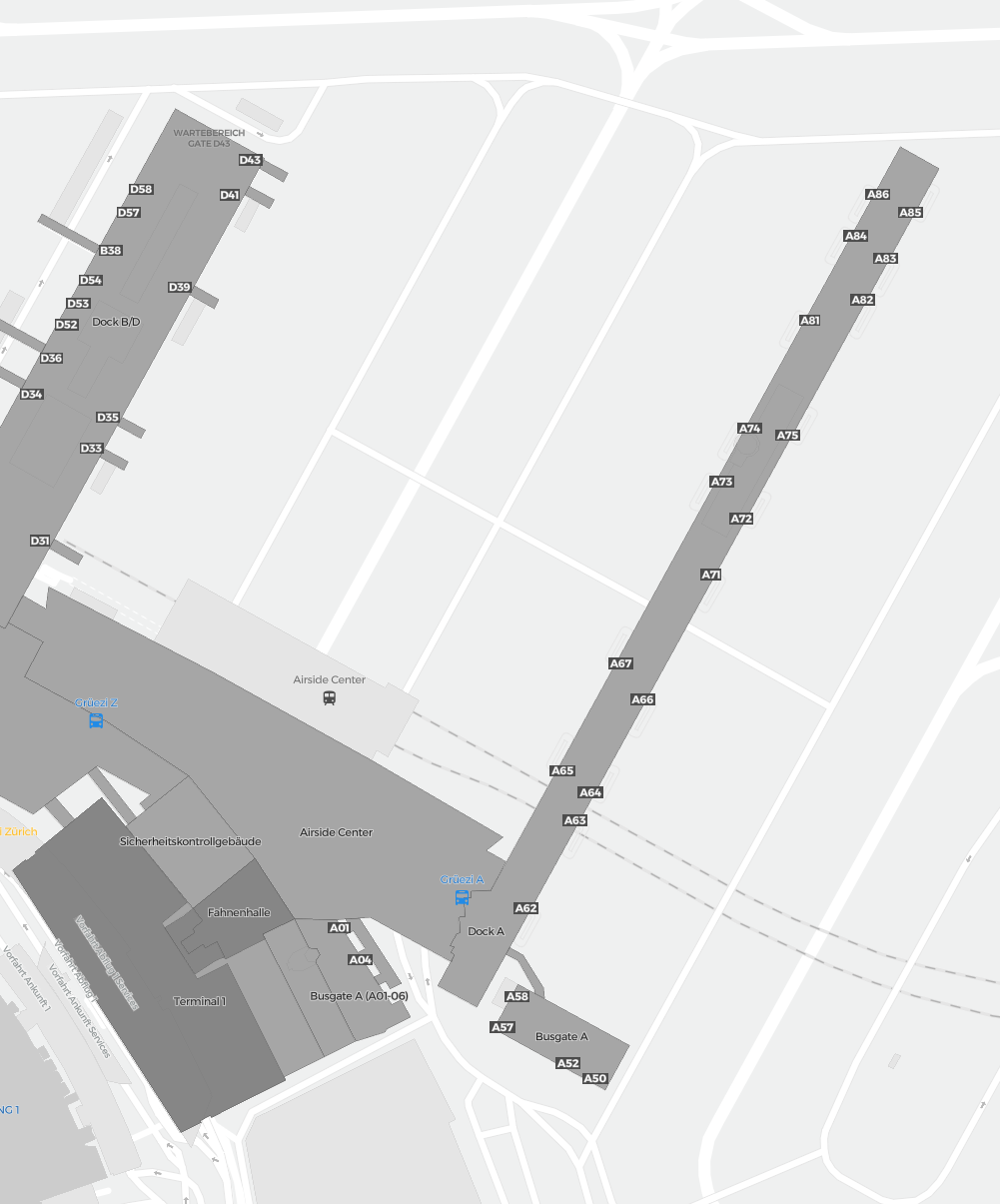 Este é um mapa com zoom sobre Zurique (ZRH). O mapa pode dar-lhe uma visão geral da área exterior com terminais, parques de estacionamento, e em alguns aeroportos também detalhes dos portões, serviços de aluguer de carros e outras comodidades ao fazer zoom.